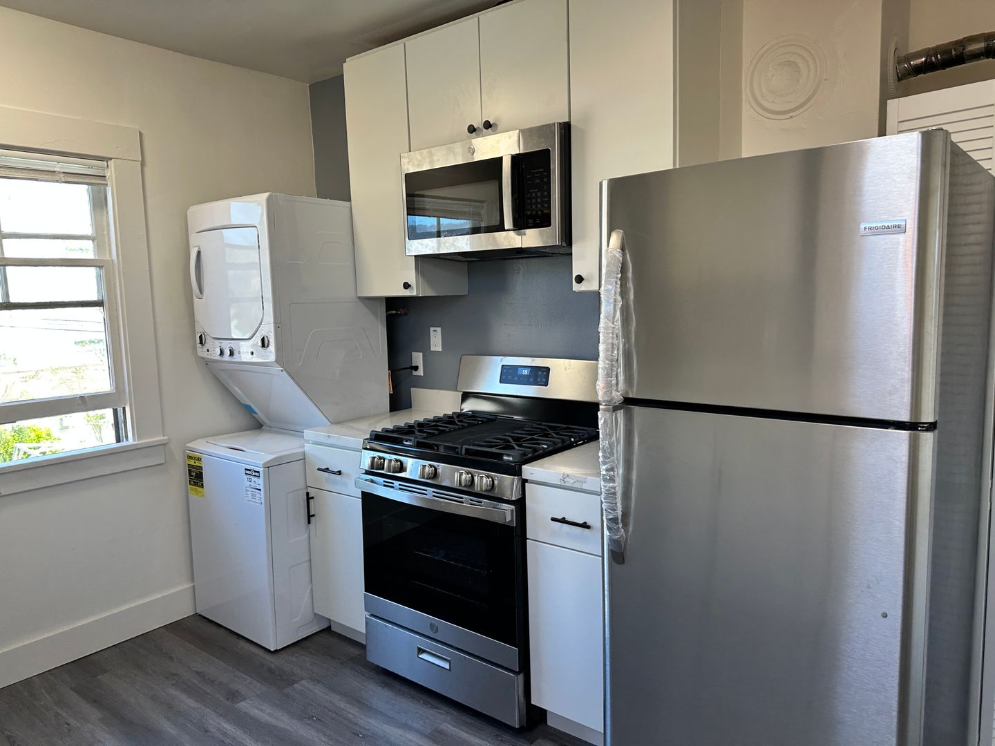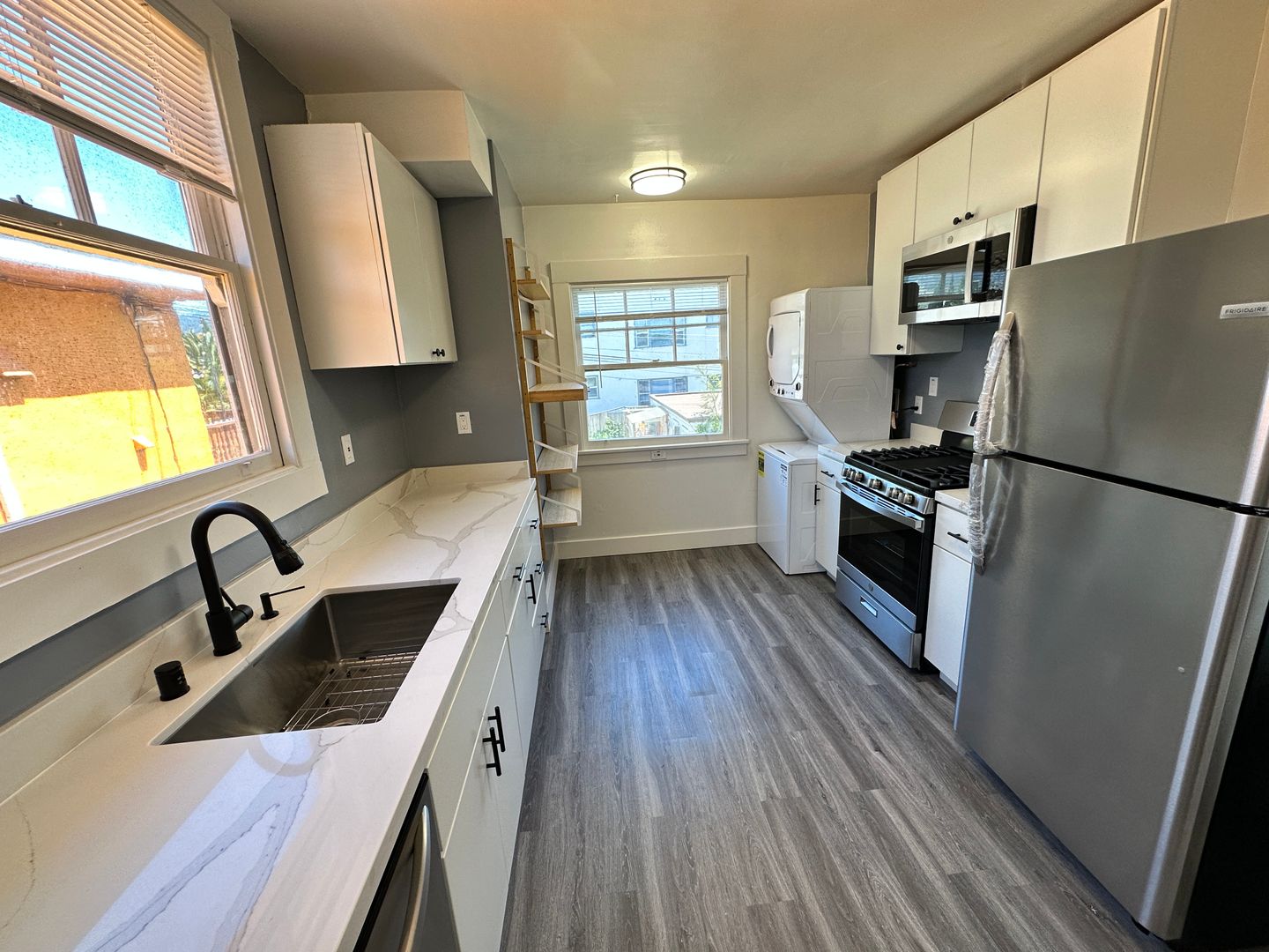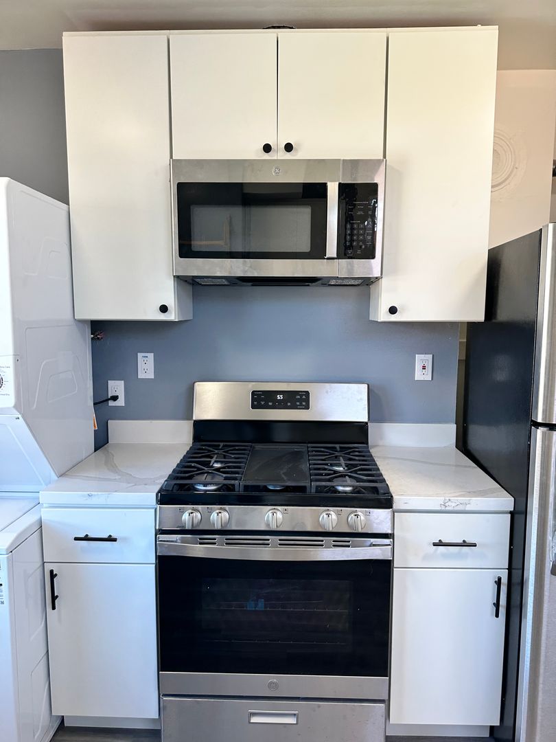 - Stainless steel appliances including refrigerator, microwave, gas stove/oven, & dishwasher.