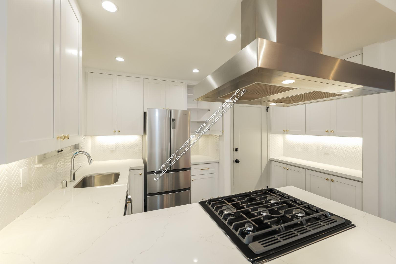 This Spanish Revival 2+story townhouse style unit offers 2 spacious bedrooms, including a large primary bedroom with walk-in closets, and a beautifully upgraded and updated bathroom. The kitchen is a chef's dream with plenty of cabinets, upgraded appliances, a tile backsplash, quartz countertops, and an updated design. The separate living and dining areas feature hardwood floors and a decorative fireplace, adding a touch of old-world charm. The unit also includes in-unit laundry with a washer and dryer in the lower level.